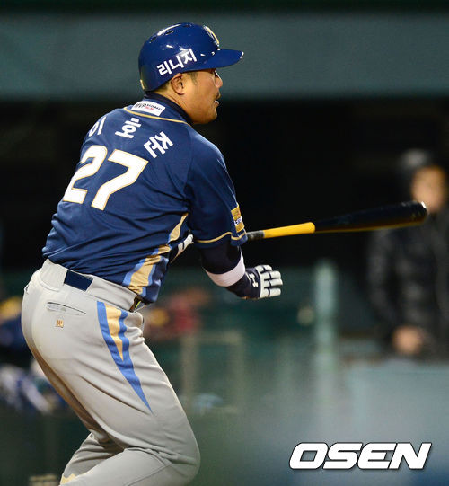 10일 오후 서울 잠실야구장에서 열린 2013 한국야쿠르트 세븐프로야구 LG 트윈스와 NC 다이노스의 경기, 3회초 2사 1,3루에서 NC 이호준이 중전 적시타를 치고 있다.