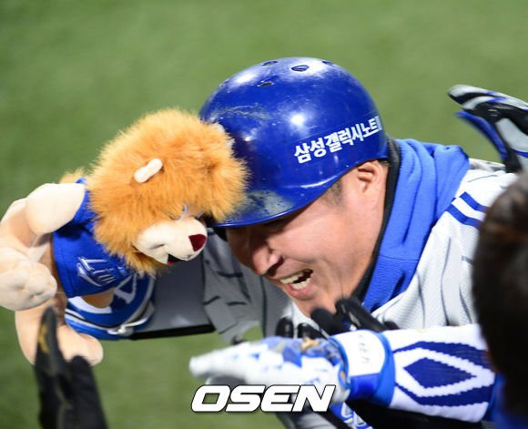 10일 오후 대구구장에서 열린 '2013 한국야쿠르트 세븐 프로야구' 삼성 라이온즈와 한화이글스 경기 4회말 2사 최형우 우월솔로 홈런을 날리고 동료들로 부터 축하를 받고 있다.