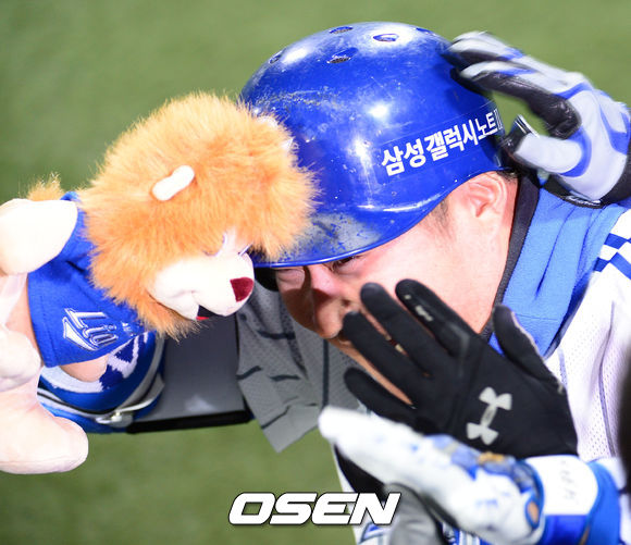 10일 오후 대구구장에서 열린 '2013 한국야쿠르트 세븐 프로야구' 삼성 라이온즈와 한화이글스 경기 4회말 2사 최형우 우월솔로 홈런을 날리고 동료들로 부터 축하를 받고 있다.