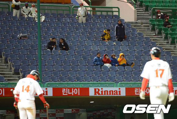 10일 오후 인천 문학구장에서 열린 '2013 한국야쿠르트 세븐 프로야구' SK 와이번스와 넥센 히어로즈의 경기 쌀쌀한 날씨에 불구하고 야구 팬들이 두꺼운 외투를 입은 채 경기를 관전하고 있다