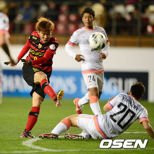 10일 오후 포항 스틸야드에서 열린 2013 아시아축구연맹(AFC) 챔피언스리그 G조 조별리그 4차전 포항 스틸러스와 산프레체 히로시마의 경기, 전반 포항 황진성의 슛이 히로시마 수비수에 맞고 굴절되고 있다.