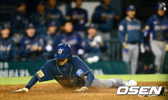 10일 오후 서울 잠실야구장에서 열린 2013 한국야쿠르트 세븐프로야구 LG 트윈스와 NC 다이노스의 경기, 5회초 무사 1루에서 NC 김종호의 우전 적시 2루타 때 1루주자 최재원에 홈까지 쇄도. 세이프 되고 있다.