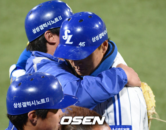 10일 오후 대구구장에서 열린 '2013 한국야쿠르트 세븐 프로야구' 삼성 라이온즈와 한화이글스 경기 6회말 1사 1,2루 이승엽 스리런 홈런을 날리고 동료들로 부터 축하를 받고 있다.