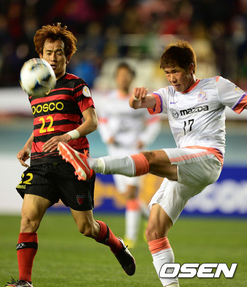 10일 오후 포항 스틸야드에서 열린 2013 아시아축구연맹(AFC) 챔피언스리그 G조 조별리그 4차전 포항 스틸러스와 산프레체 히로시마의 경기, 전반 히로시마 박형진이 포항 노병준에 앞서 볼을 걷어내고 있다.