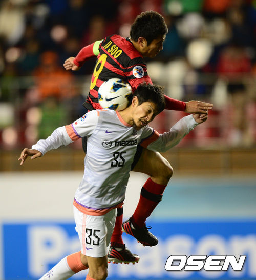 10일 오후 포항 스틸야드에서 열린 2013 아시아축구연맹(AFC) 챔피언스리그 G조 조별리그 4차전 포항 스틸러스와 산프레체 히로시마의 경기, 전반 포항 황지수가 히로시마 나가지마와 공중볼을 다투고 있다.