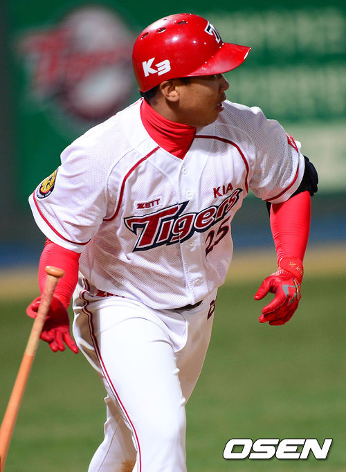 10일 오후 광주 무등경기장에서 '2013 한국야쿠르트 세븐 프로야구' KIA 타이거즈 대 두산 베어스의 경기가 열렸다. 7회말 KIA 공격 무사 만루 상황 3번 이범호가 역전 희생플라이를 날리고 타구를 바라보고 있다.