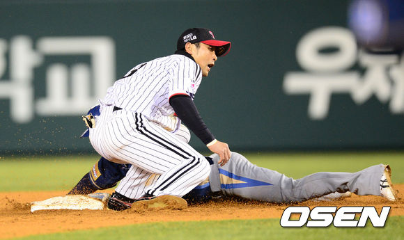 10일 오후 서울 잠실야구장에서 열린 2013 한국야쿠르트 세븐프로야구 LG 트윈스와 NC 다이노스의 경기, 7회초 1사 1,3루 NC 이호준 타석 때 LG 서동욱이 도루를 시도한 1루주자 차화준을 태그 했으나 세이프 되고 있다.