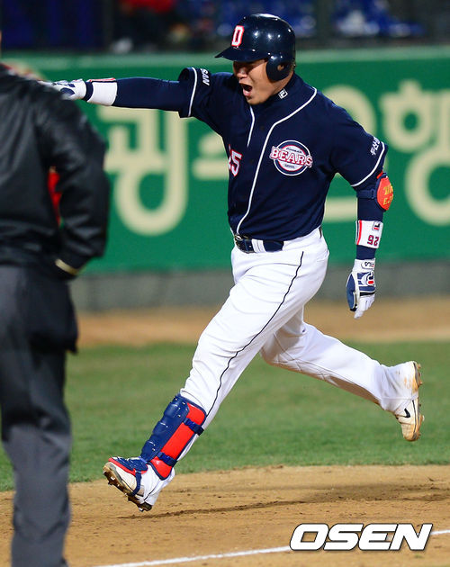 10일 오후 광주 무등경기장에서 '2013 한국야쿠르트 세븐 프로야구' KIA 타이거즈 대 두산 베어스의 경기가 열렸다. 9회초 두산 공격 2사 주자없는 상황 8번 양의지가 동점 중월 솔로포를 날리고 환호하고 있다.