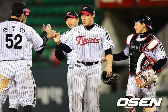 경기 종료 후 LG 선수들이 승리의 기쁨을 나누고 있다. /sunday@osen.co.kr