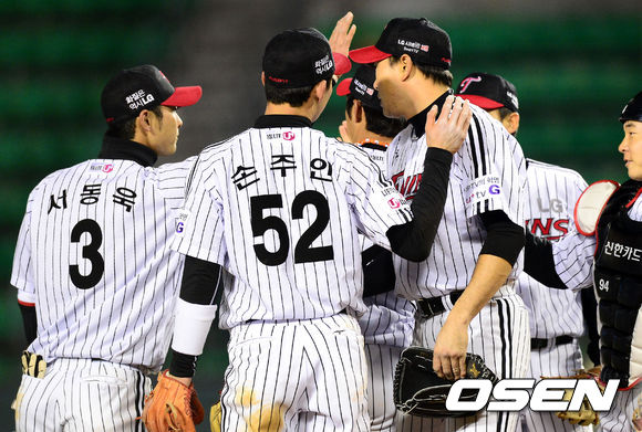 경기 종료 후 LG 선수들이 승리의 기쁨을 나누고 있다. /sunday@osen.co.kr