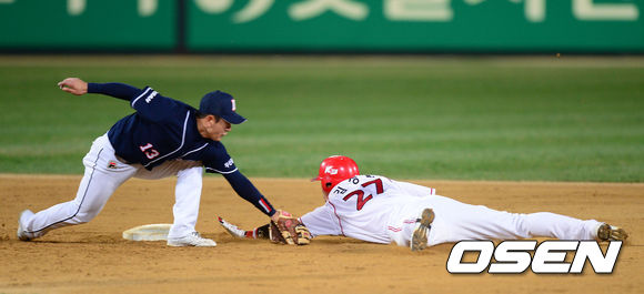 10일 오후 광주 무등경기장에서 '2013 한국야쿠르트 세븐 프로야구' KIA 타이거즈 대 두산 베어스의 경기가 열렸다. 연장 11회말 KIA 공격 1사 1루 상황 주자 김상현이 2루 도루에 실패하고 있다.