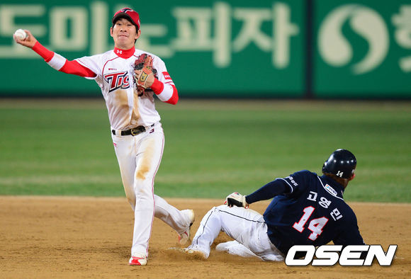 10일 오후 광주 무등경기장에서 '2013 한국야쿠르트 세븐 프로야구' KIA 타이거즈 대 두산 베어스의 경기가 열렸다. 연장 12회초 두산 공격 1사 1루 상황, 1번 이종욱의 내야 땅볼 때 KIA 2루수 홍재호가 병살 플레이를 펼치고 있다.