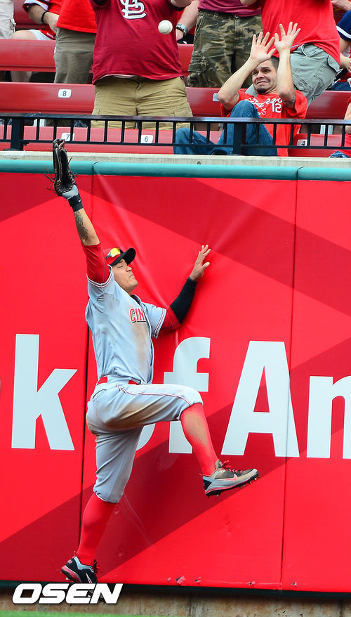 5회말 2사 주자 없는 상황에서 세인트루이스 존제이의 중월 솔로홈런때 신시내티 중견수 추신수가 뛰어올랐으나 잡아내지 못하고 있다.