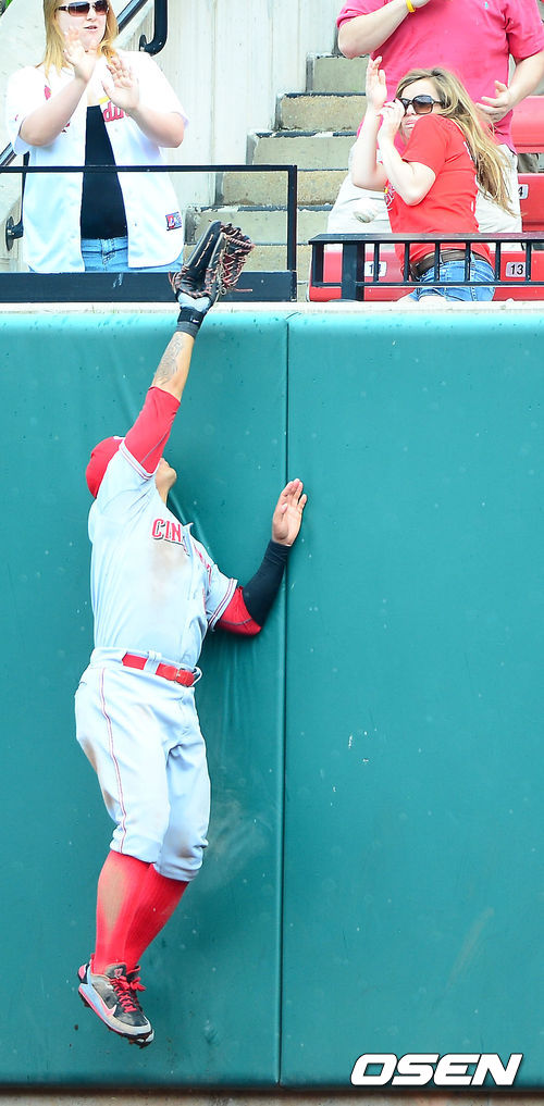 6회말 2사 주자 3루 세인트루이스 맷 카펜터 투런 홈런때 신시내티 중견수 추신수가 뛰어올랐으나 잡아내지 못하고 있다.