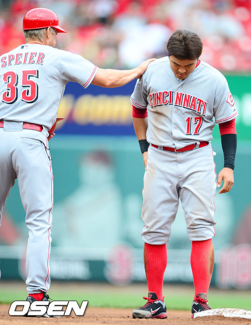 3회초 2사 주자 1루 신시내티 헤이시의 유격수 땅볼때 2루에서 추신수가 아웃 당한후 아쉬워하고 있다. / rumi@osen.co.kr