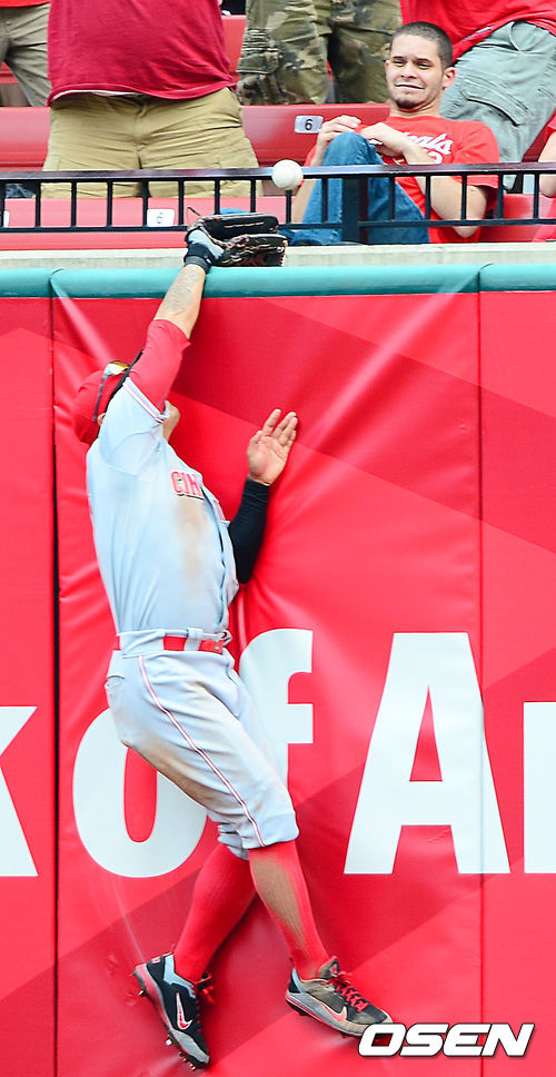 5회말 2사 주자 없는 상황에서 세인트루이스 존제이의 중월 솔로홈런때 신시내티 중견수 추신수가 뛰어오르고 있다. / rumi@osen.co.kr