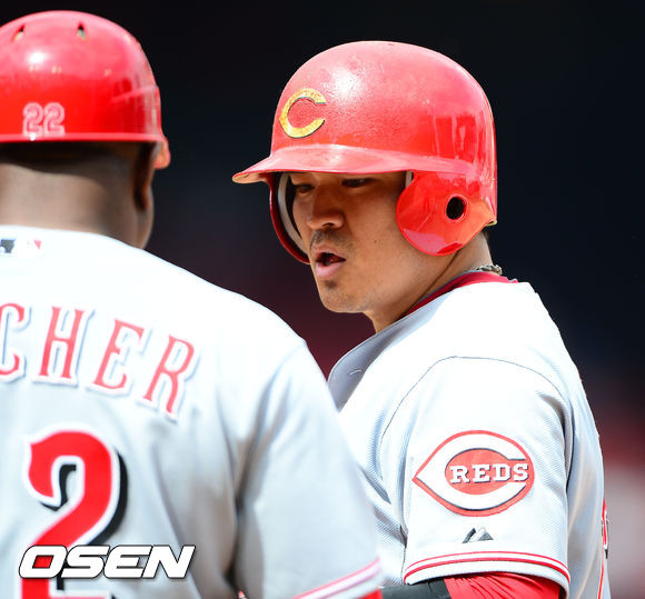6회초 선두타자로 타석에선 신시내티 추신수가 몸에 볼을 맞고 1루로 진루, 빌리 해처와 하이파이브를 하고 있다. / rumi@osen.co.kr