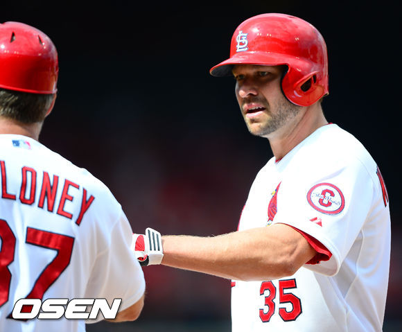 7회말 2사 주자 1,3루 세인트루이스 선발 웨스트브룩이 좌전 1타점 적시타를 날린 후 1루에서 기뻐하고 있다./ rumi@osen.co.kr