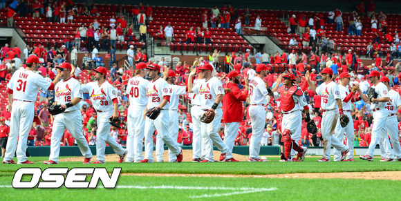 경기를 마치고 세인트루이스 선수들이 그라운드 위에서 승리의 기쁨을 나누고 있다. / rumi@osen.co.kr