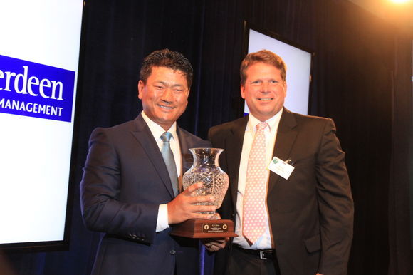 최경주가 전 GWAA회장 덕 퍼거슨 AP선임기자로부터 아시아에서 최초로 찰리 바틀렛 상을 수상하고 있다.