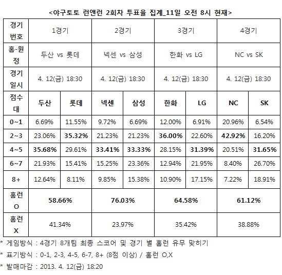 두산-롯데, 넥센-삼성, 한화-LG, NC-SK전을 대상으로 진행되는 야구토토 런앤런 2회차 게임은 경기시작 10분 전인 12일 오후 6시 20분에 발매가 마감된다.
