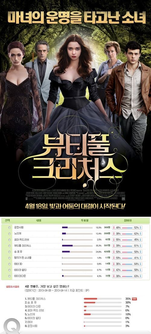 '뷰티풀 크리처스'는 최근 영화 전문사이트 맥스무비와 롯데시네마에서 진행된 '4월 셋째 주 가장 보고 싶은 영화'를 묻는 투표에서 1위를 석권했다.