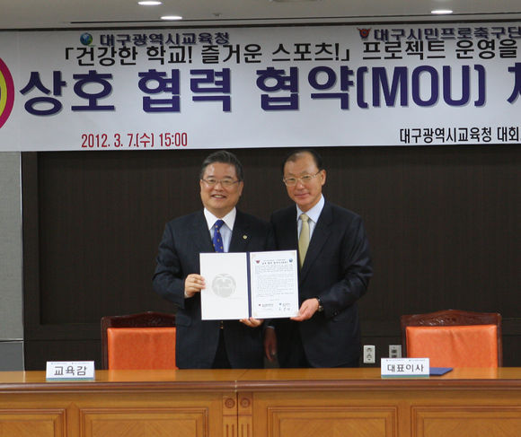 대구FC는 지난해 3월 대구시 교육청과 '건강한 학교! 즐거운 스포츠!' 프로젝트 운영을 위한 MOU를 체결함에 따라 선수들이 학교를 방문해 △배식 봉사 △토요 축구클리닉 △체육수업 △팬 사인회 △진로탐색 및 직업체험 △선생님 축구보러가요! 아빠 축구보러가요! △대구FC 축구야 놀자 등 을 진행했으며 총 203회의 지역사회공헌활동을 실시해 3만4000여명의 학생들에게 혜택을 지원했다.