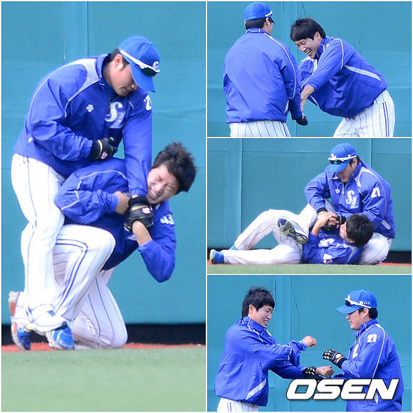 경기에 앞서 삼성 오승환과 이우선이 외야에서 몸을 풀며 장난을 치고 있다.