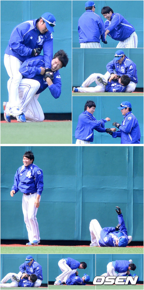 경기에 앞서 삼성 오승환과 이우선이 외야에서 몸을 풀며 장난을 치고 있다.
