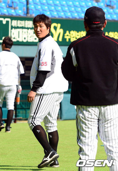 11일 오후 서울 잠실구장에서 열리는 '2013 한국야쿠르트 세븐 프로야구' LG 트윈스와 NC 다이노스의 경기 시작 전 이진영이 김기태 감독과 이야기를 나누고 있다.