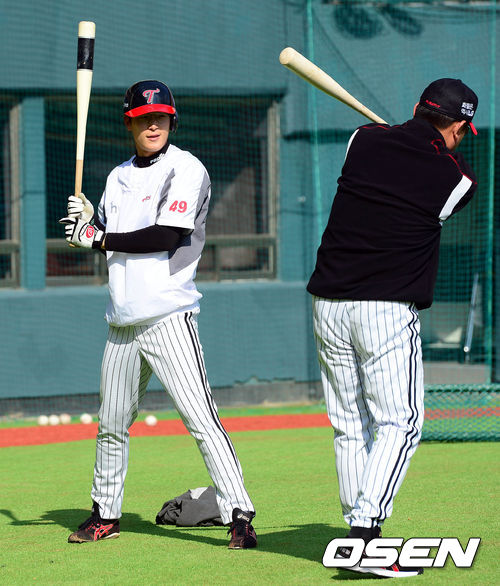11일 오후 서울 잠실구장에서 열리는 '2013 한국야쿠르트 세븐 프로야구' LG 트윈스와 NC 다이노스의 경기 시작 전 김기태 감독(오른쪽)이 문선재의 훈련을 돕고 있다.