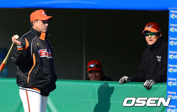 경기에 앞서 한화 송진우, 이종범 코치가 삼성 훈련을 지켜보며 생각에 잠겨 있다.