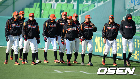 경기에 앞서 한화 투수조가 미팅을 마치고 더그아웃으로 향하고 있다.