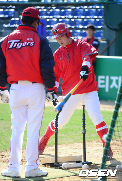 11일 오후 광주 무등경기장에서 열리는 '2013 한국야쿠르트 세븐 프로야구' KIA 타이거즈 대 두산 베어스의 경기를 앞두고 KIA 나지완이 김용달 코치와 타격연습을 하고 있다.