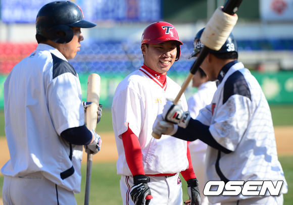 11일 오후 광주 무등경기장에서 열리는 '2013 한국야쿠르트 세븐 프로야구' KIA 타이거즈 대 두산 베어스의 경기를 앞두고 KIA 이범호와 두산 김현수, 이종욱이 대화를 나누고 있다.