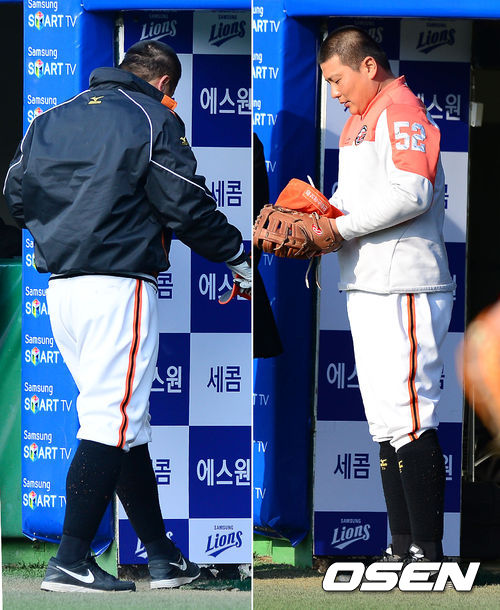 경기에 앞서 한화 김태균이 취재진과 인사를 나누고 있다. 김태균을 비롯한 한화 선수단은 대부분 머리를 삭발해 눈길을 끌었다.