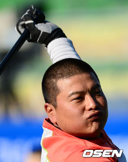 경기에 앞서 한화 김태균이 배팅훈련을 하고 있다. 김태균을 비롯한 한화 선수단은 대부분 머리를 삭발해 눈길을 끌었다.