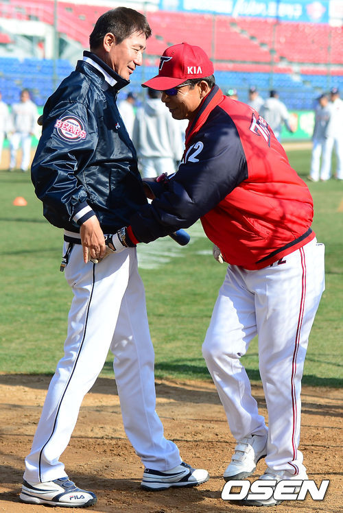 11일 오후 광주 무등경기장에서 열리는 '2013 한국야쿠르트 세븐 프로야구' KIA 타이거즈 대 두산 베어스의 경기를 앞두고 두산 정명원 코치와 KIA 김용달 코치가 인사를 나누고 있다.