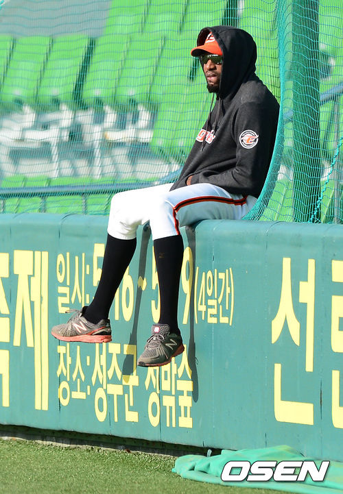 경기에 앞서 한화 바티스타가 삼성 선수들의 훈련을 지켜보고 있다. 이날 한화 선수단은 대부분 머리를 삭발해 눈길을 끌었다.