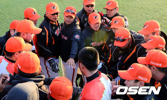 경기에 앞서 한화 선수들이 미팅을 갖고 파이팅을 외치고 있다.