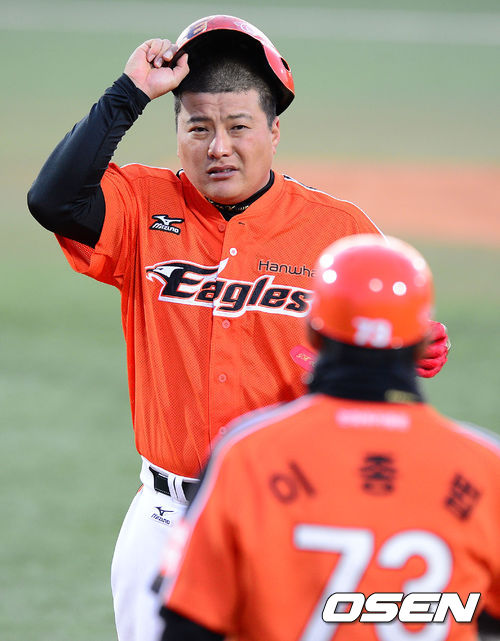 1회초 1사 2루에서 선제 적시타를 날린 한화 김태균이 1회초 공격을 마치고 이종범 코치와 이야기를 나누고 있다.
