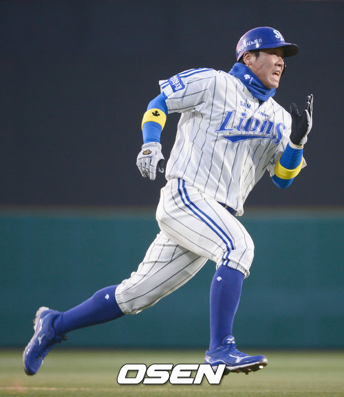 11일 오후 대구구장에서 '2013 한국야쿠르트 세븐 프로야구' 삼성 라이온즈와 한화이글스 경기 1회말 1사 2루 이승엽의 적시타때 2루 주자 조동찬 동점 득점을 올리고 있다.