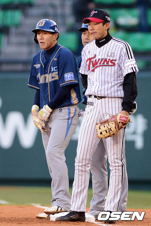 11일 오후 서울 잠실구장에서 열린 '2013 한국야쿠르트 세븐 프로야구' LG 트윈스와 NC 다이노스의 경기 1회초 무사 2루 차화준이 1타점 적시타를 치고 1루 베이스에 서 있다.