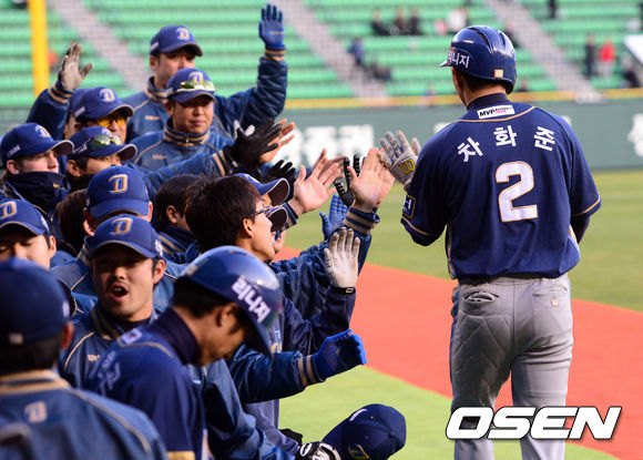 11일 오후 서울 잠실구장에서 열린 '2013 한국야쿠르트 세븐 프로야구' LG 트윈스와 NC 다이노스의 경기 1회초 무사 1,3루 이호준의 내야땅볼 상황 3루수 실책으로 3루주자 차화준이 득점 후 덕아웃에서 동료들과 하이파이브를 하고 있다.
