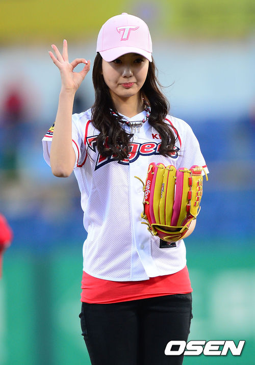 11일 오후 광주 무등경기장에서 '2013 한국야쿠르트 세븐 프로야구' KIA 타이거즈 대 두산 베어스의 경기가 열렸다. 시구자로 나선 2012 미스코리아 선 이정빈이 포수와 사인을 교환하는 제스처를 취하고 있다.