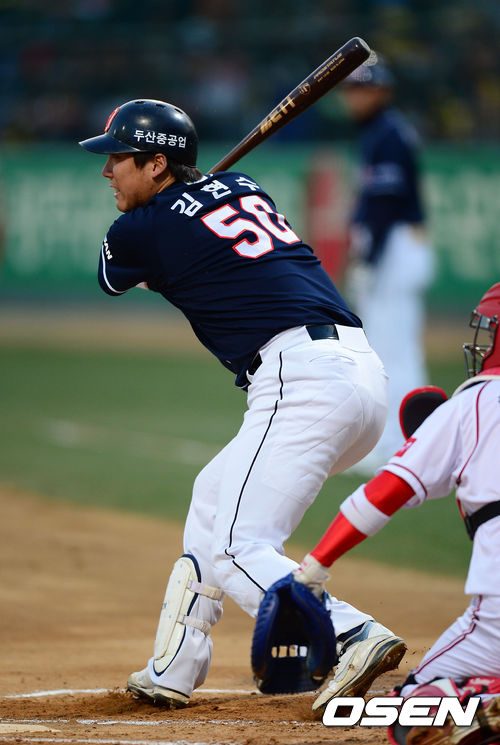 11일 오후 광주 무등경기장에서 '2013 한국야쿠르트 세븐 프로야구' KIA 타이거즈 대 두산 베어스의 경기가 열렸다. 1회초 두산 공격 무사 1, 2루 상황 3번 김현수가 1타점 적시타를 날리고 있다.