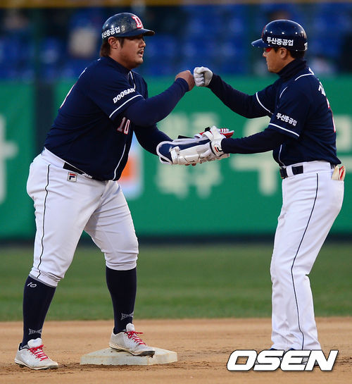 11일 오후 광주 무등경기장에서 '2013 한국야쿠르트 세븐 프로야구' KIA 타이거즈 대 두산 베어스의 경기가 열렸다. 1회초 두산 공격 1사 1, 2루 상황에서 5번 최준석이 2타점 2루타를 날리고 김민재 1루 코치와 인사를 나누고 있다.