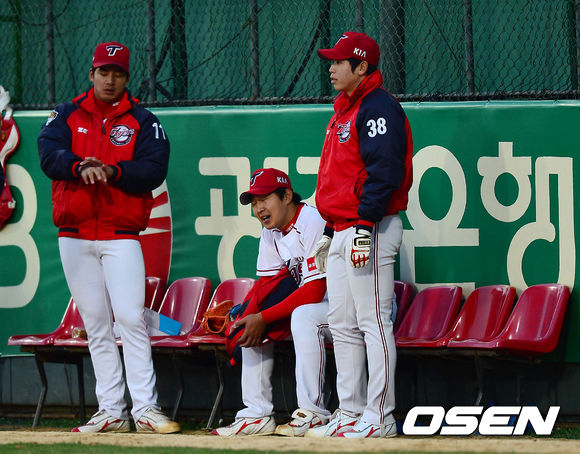 11일 오후 광주 무등경기장에서 '2013 한국야쿠르트 세븐 프로야구' KIA 타이거즈 대 두산 베어스의 경기가 열렸다. KIA 선발 박경태(가운데)가 1회초 두산 공격에서 3실점한 뒤 벤치로 들어와 아쉬운 표정을 짓고 있다.