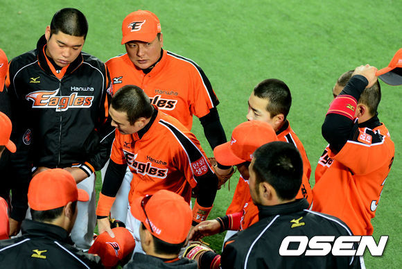2회말 수비에서 역전을 허용한 한화 선수들이 아쉬워하고 있다.