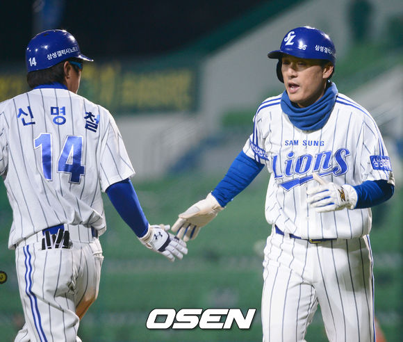 11일 오후 대구구장에서 '2013 한국야쿠르트 세븐 프로야구' 삼성 라이온즈와 한화이글스 경기 3회말 1사 2,3루 박한이의 2타점 적시타때 3루 주자 이승엽 득점을 올리며 신몀철의 환영을 받고 있다.